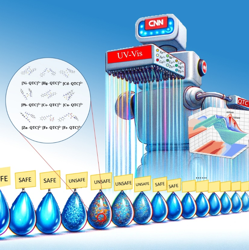 此外,该团队合成一种新的多金属离子响应比色探针,将该探针与便捷式的紫外-可见分光光度法和机器学习算法模型相结合,能够同时检测Fe(II)、Fe(III)、Co(II)、Ni(II)、Cu(II)、Zn(II)、Cd(II)、Hg(II)、Pb(II)等9种金属离子,检测可在30-300秒内完成,检测灵敏度完全满足常规水质标准,为公共饮用水安全检测提供了一种方便快捷的方法。