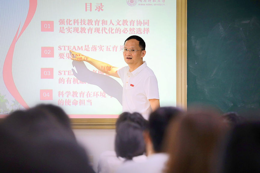 9月14日,他以《党的二十届三中全会精神对科学教育在环境与健康应用场景的启示》为题为2023级科学教育专业学生上了专题思政课。他以“孔子六艺”为引,从强化科技教育和人文教育协同的必要性、落实五育并举的重要渠道、STEAM教育理念与科学教育的有机融合、科学教育在环境与健康领域中的使命担当四个方面,激发同学们对“思政+学科融合”的思考,勉励同学们在学习专业知识的同时,培养正确的世界观、人生观和价值观,努力成长为党和人民需要的“未来之师”。