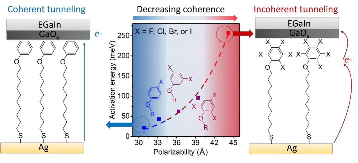 掌握分子结电荷传输的根本机制对于界面工程、催化、纳米电子和能源等研究领域具有重要意义。该论文在不改变分子层厚度且没有引入氧化还原基团的前提下,通过苯酚上的卤素取代实现分子结隧穿机制的逐步调整,实现了介于相干与非相干之间的隧穿机制。