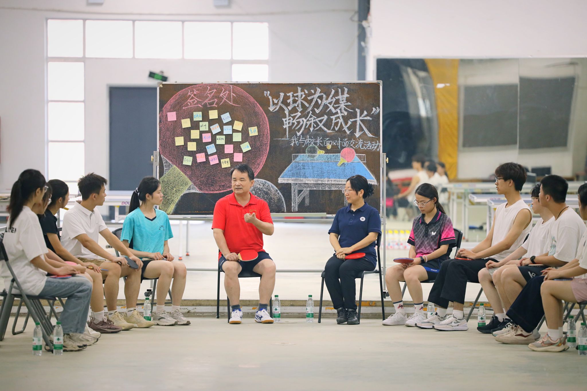 比赛后,师生们在轻松愉快的氛围中围坐交流,分享自己在乒乓球运动或成长过程中的难忘经历。青年学子们围绕习近平总书记给谢依特小学戍边支教西部计划志愿者服务队队员重要回信精神、体育运动助力成长、师范生就业等话题进行提问,张龙海与廖志丹认真倾听并逐一解答,结合自身工作经验与成长经历,与学生代表们分享拼搏的故事,共绘成长蓝图,共述青春感悟,共谋成长路径。