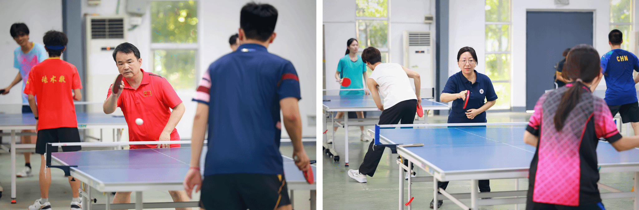 老师和学生代表自由组队,进行单双打趣味比赛。赛场上,双方你推我挡,直板、横拍、削球、对抗、扣杀,不断在进攻与防守之间转换策略,敏捷的身手、细腻的击球、精准的远台,乒乓球在空中划出弧线,无声宣扬着运动的魅力。现场笑声与欢呼声此起彼伏,不绝于耳。
