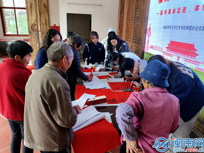 在漳浦县,实践团成员们来到素有“闽南井冈山”之称的车本村革命老区,在村干部和村民的讲述下重温了那段红色的革命岁月,深刻领悟了“我将无我,不负人民”的为民情怀,实践团成员们还向村民们献上学院设计的新春“福”字,用墨香传递新春祝福。