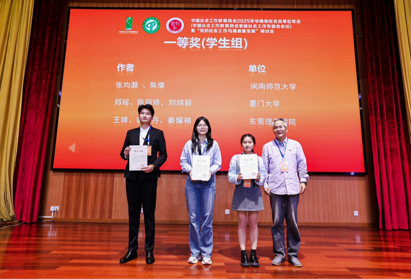 漳州新闻网讯(陈景亮)近日,中国社会工作教育协会2025年华南地区会员单位年会(中国社会工作教育协会家庭社会工作专委会会议)暨“党的社会工作与高质量发展”研讨会在东莞顺利召开。闽南师大法学院陈景亮副教授指导的23级社会工作本科生张均灏、陈倩合作论文《“脱域与再嵌入”:云贵易地搬迁社区协同治理路径研究——基于四市八个搬迁社区的质性调查》荣获学生组一等奖。