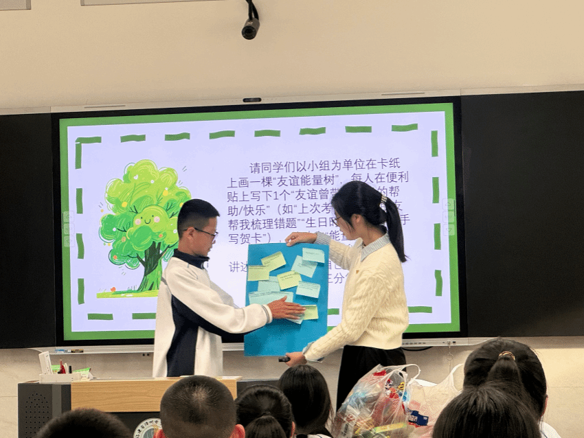 签约仪式结束后,马克思主义学院2025级思想政治教育专业硕士研究生叶琳珊和张淑艳担任主讲人,在漳州三中初中部开展“思政送教”活动,通过课堂讲解、情景演绎与互动分享等多种形式,与学生进行深入交流。