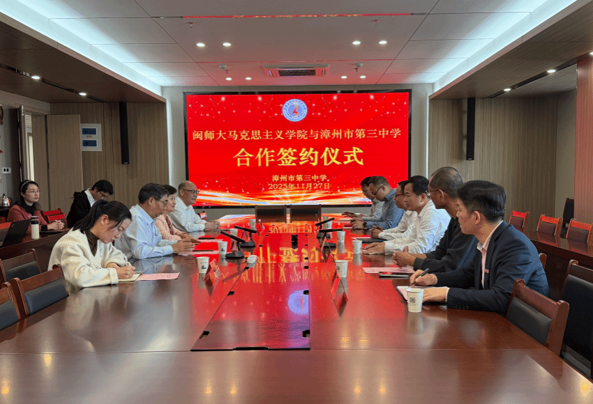 漳州新闻网讯(沈书伊 李倩)为深化校校协同合作,整合优质教育资源,11月27日下午,问鼎手机版app马克思主义学院与漳州第三中学举行“教育协同发展战略”合作签约仪式。问鼎手机版app马克思主义学院党委书记方琼、院长陈再生、副院长黄耀明、郑育琛教授,漳州三中校长黄志勇、党总支书记庄清寿及该校部分教师代表共同出席仪式。