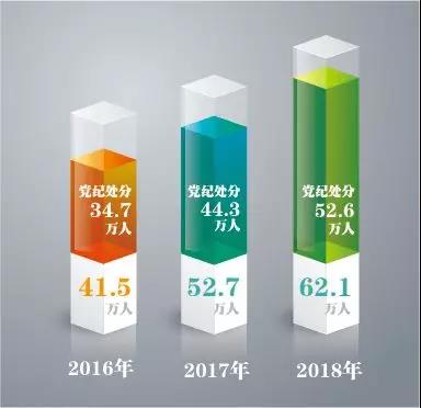 2018年共处分62.1万人(其中党纪处分52.6万人),而2016年、2017年这一数字分别为41.5万人(其中党纪处分34.7万人)、52.7万人(其中党纪处分44.3万人)。
