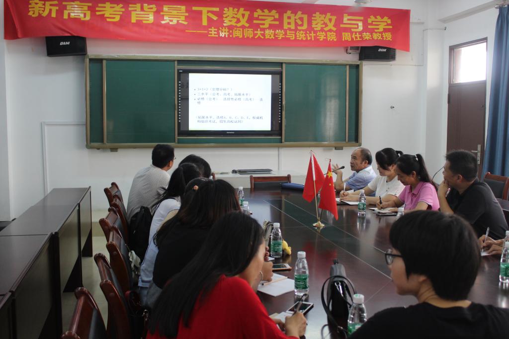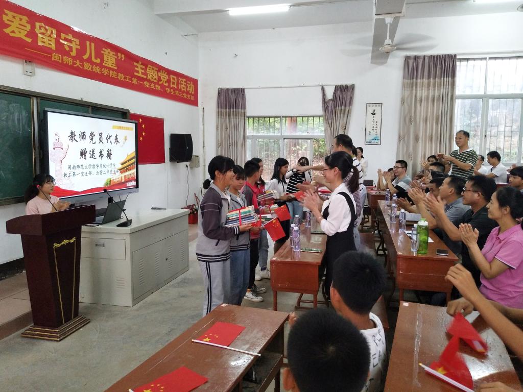 活动现场,云霄二中的学生们在绘着“庆祝新中国成立70周年”的黑板报前,用马克笔在红色的卡纸上认真地写下他们对祖国的祝福。随后举行赠书活动,数统学院教师党员代表林梦雷、林晓、胡海智、陈明,以及学生第三党支部党员代表陈天航,为云霄二中留守儿童赠送书籍共计434本。学院还与云霄二中共建“常青数快乐学”党员爱心书吧,以“一本书籍,两地互动,情牵三方”的形式构建起师生党员新的志愿服务平台。学生第三党支部的党员们还为云霄二中的学生开展素质拓展活动。当天,教工第一党支部书记、数学系主任周仕荣教授为云霄二中党员教师讲授《新高考背景下数学的教与学》专题讲座。